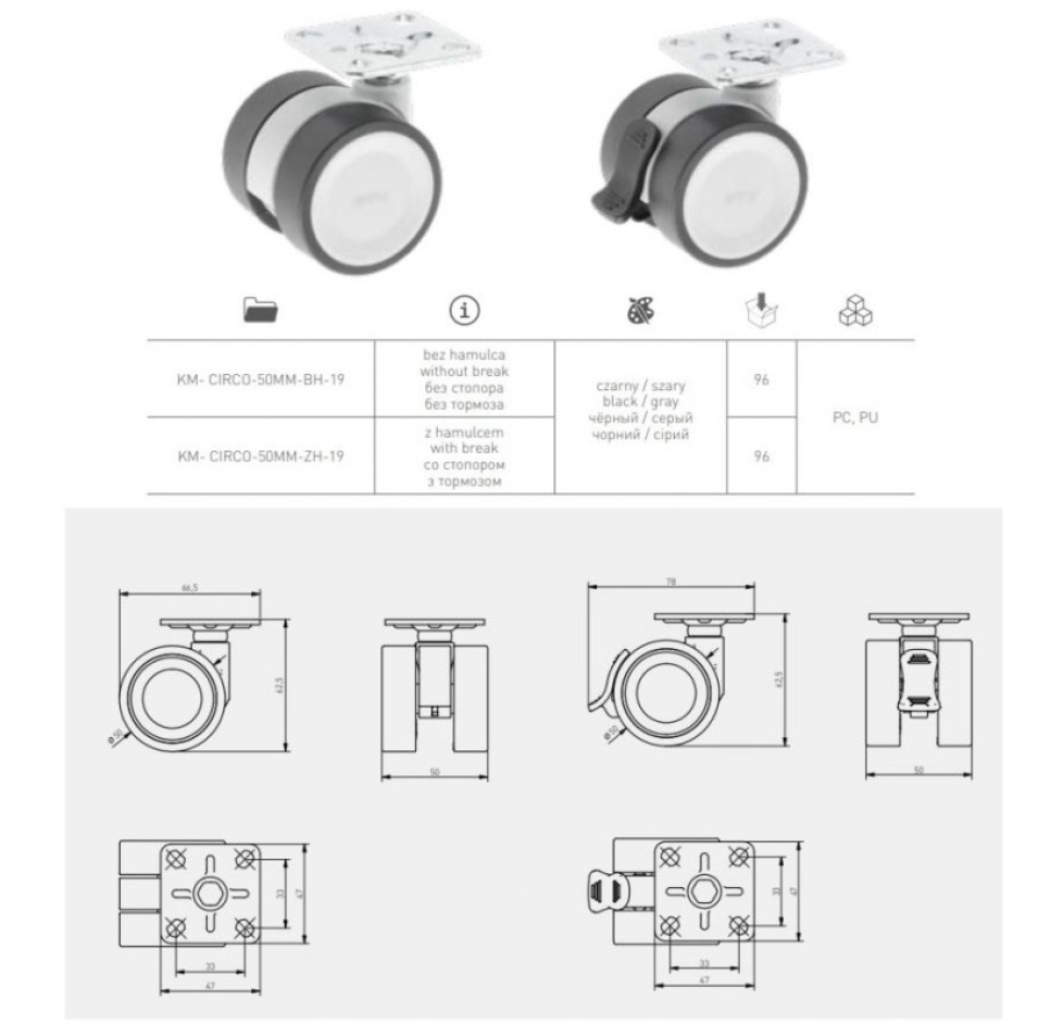 Арт.:KM-CIRCO-50MM-BH-19 Вид ролика:поворотний Виробник:GTV Висота :62,5 мм Діаметр:50 мм Модель:Circo Навантаження:50 кг Наличие стопора:Ні Одиниця виміру:шт. Колір::хром/чорний Кількість в упаковці:100